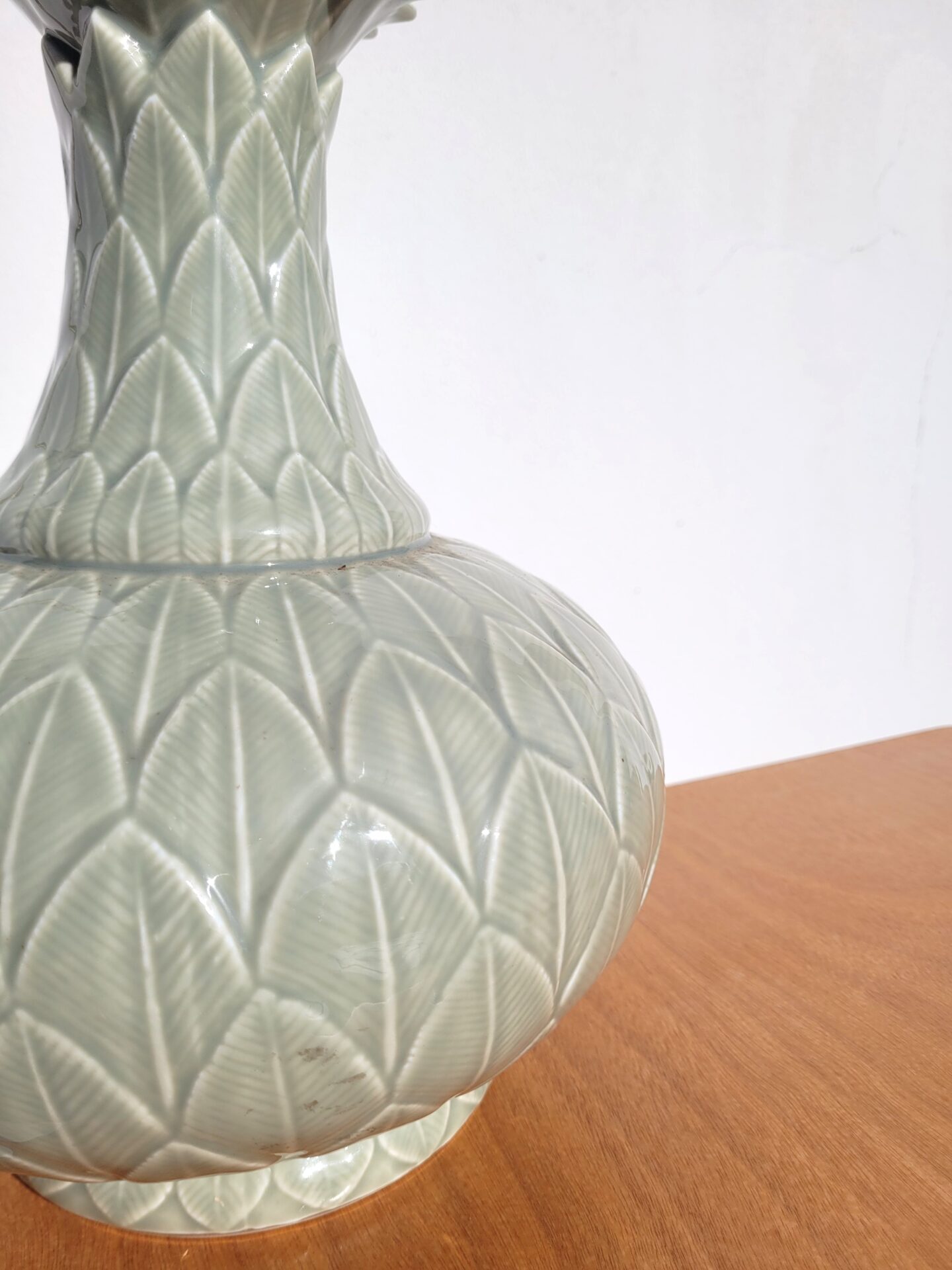 Il s’agit d’une céramique de production Française (Paris) à la forme floral, ananas? au col évasé comme un panache de feuilles, avec un très joli émaillage vert céladon / vert d’eau.