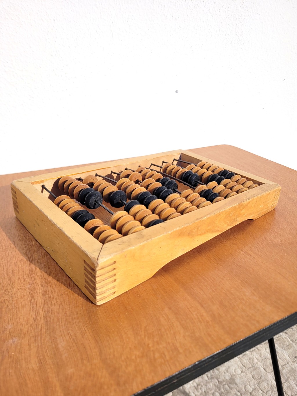 Il est assemblé en bois de hêtre, les billes glissent sur des tiges en métal.