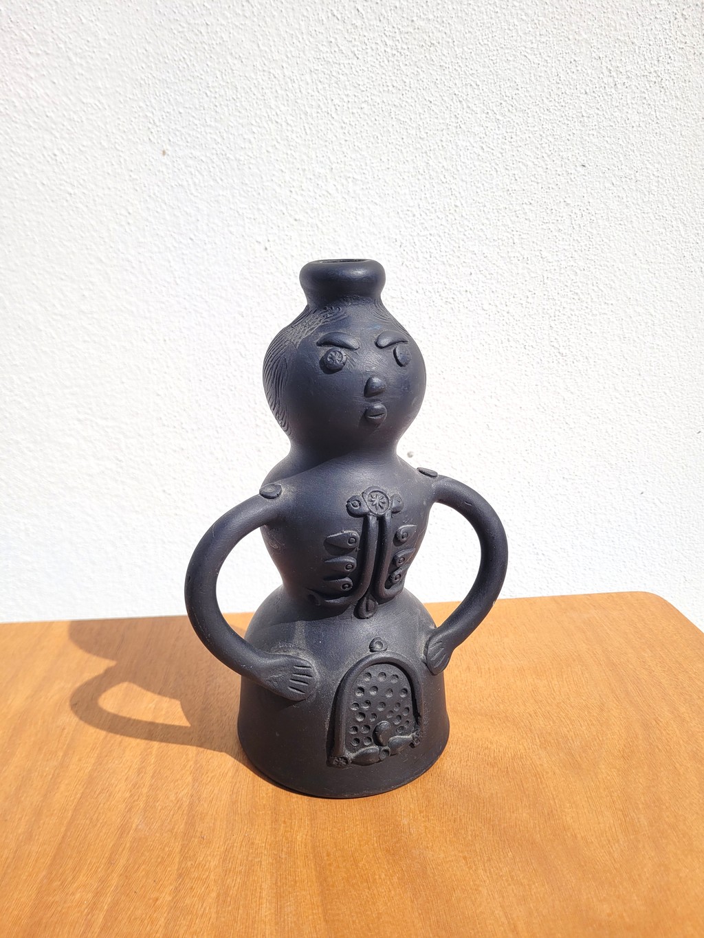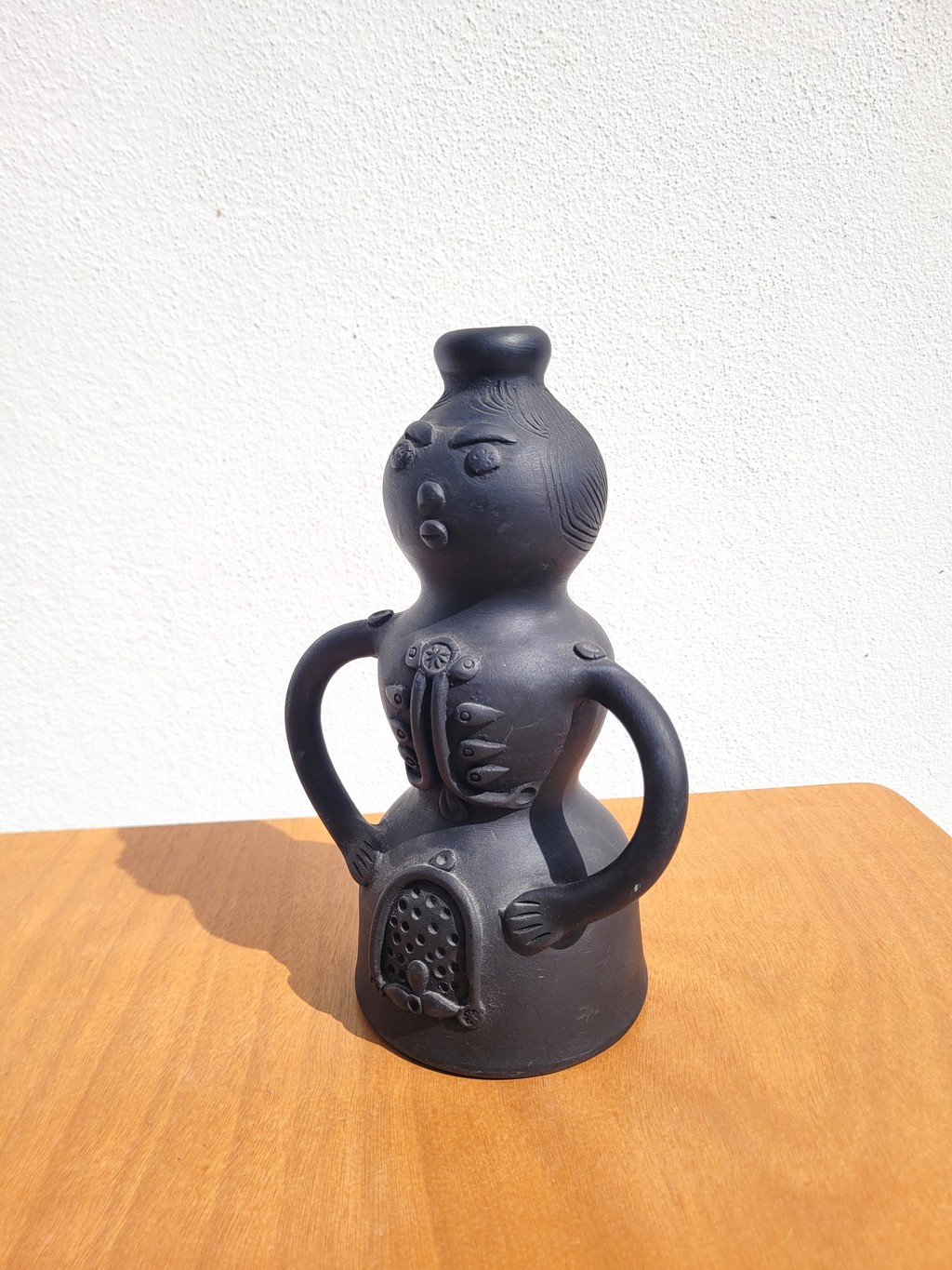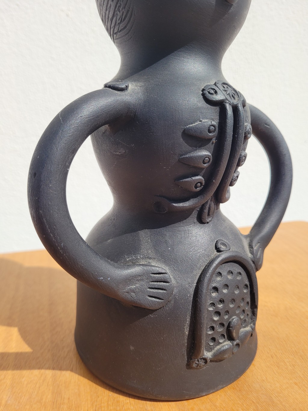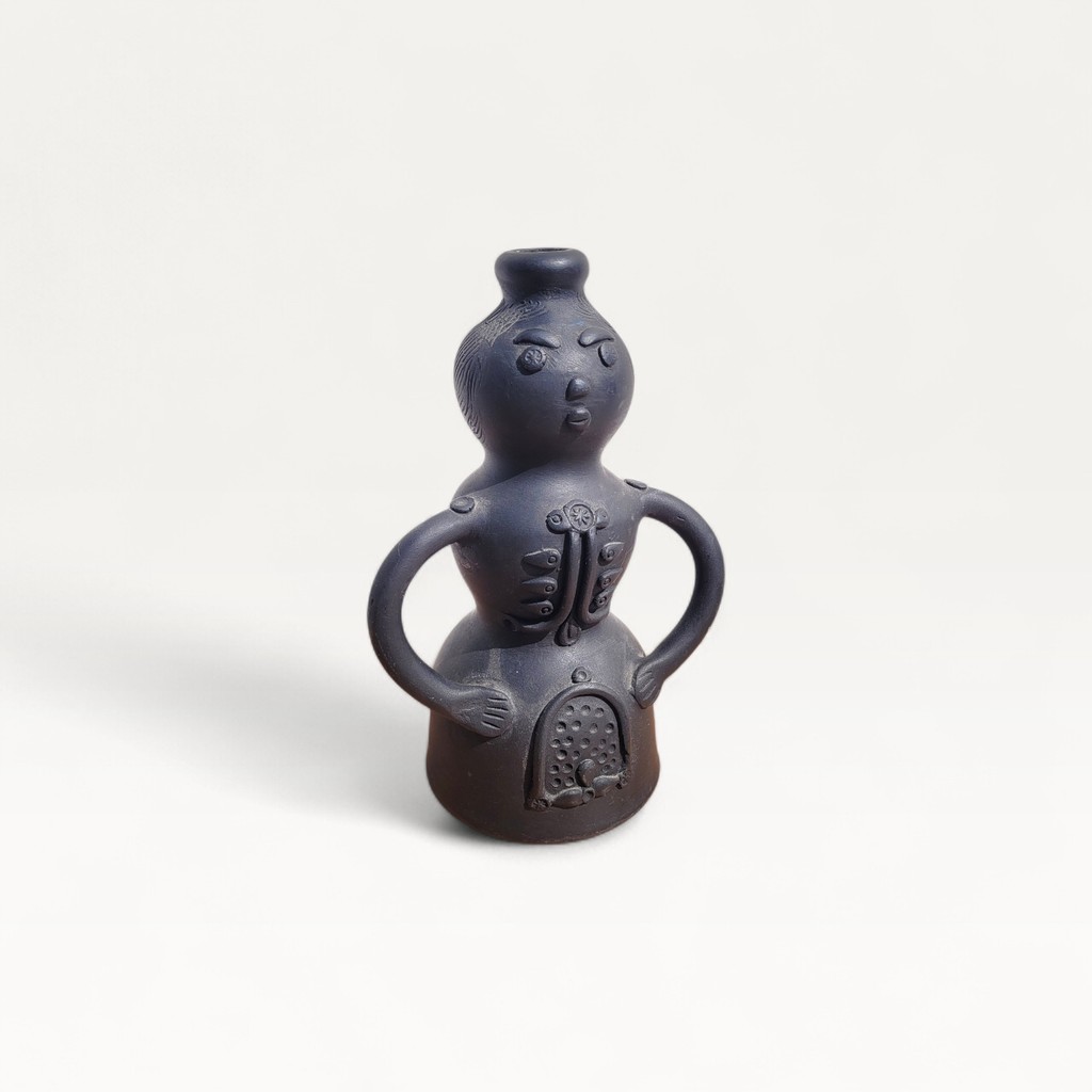 Cet objet présente une forme anthropomorphe avec un visage, des bras et des détails en relief. L’ensemble est réalisé en céramique noire mate, dans un style figuratif assez typique des productions des années 60–70.