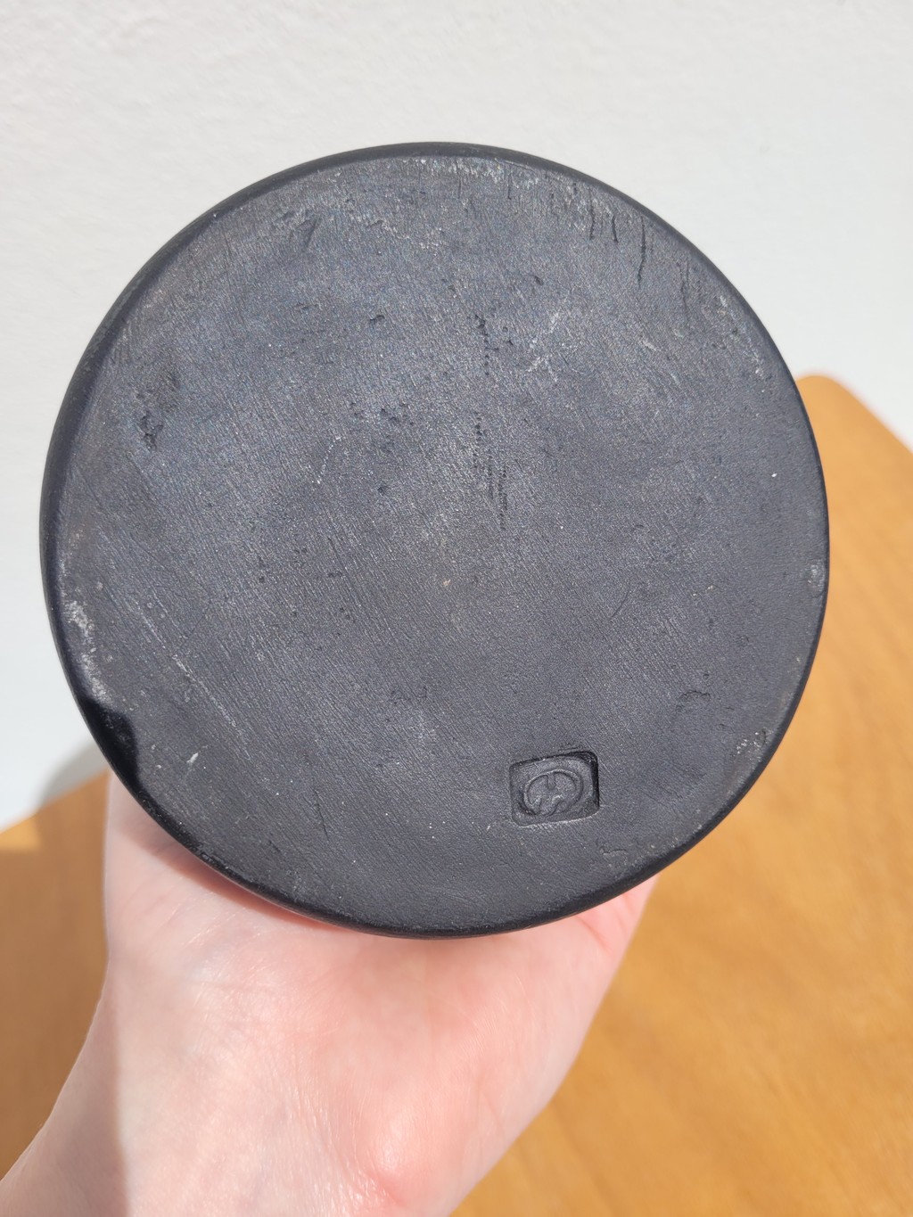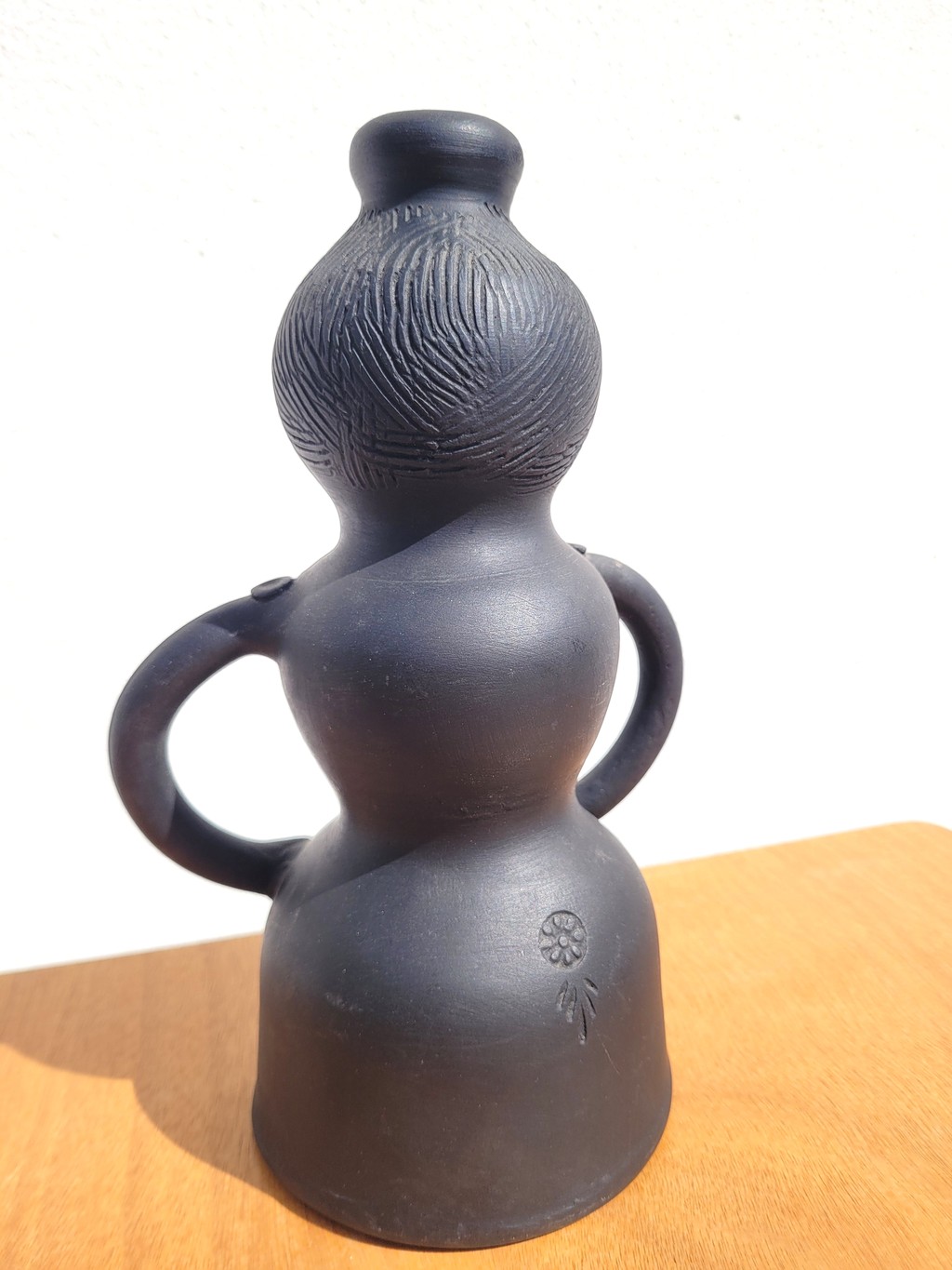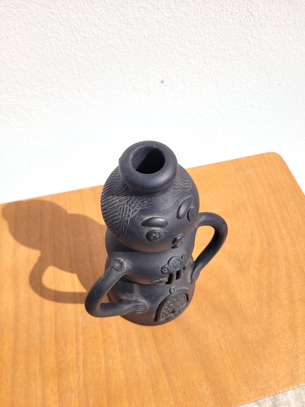 Cet objet présente une forme anthropomorphe avec un visage, des bras et des détails en relief. L’ensemble est réalisé en céramique noire mate, dans un style figuratif assez typique des productions des années 60–70.