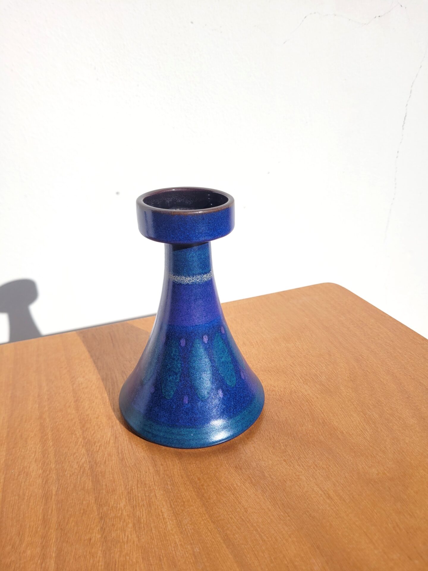 Il est en céramique émaillée dans un joli camaïeu de bleue (bleu canard, bleu nuit, violet/vert) et une forme élégante et évasée typique du style Mid-Century Moderne.