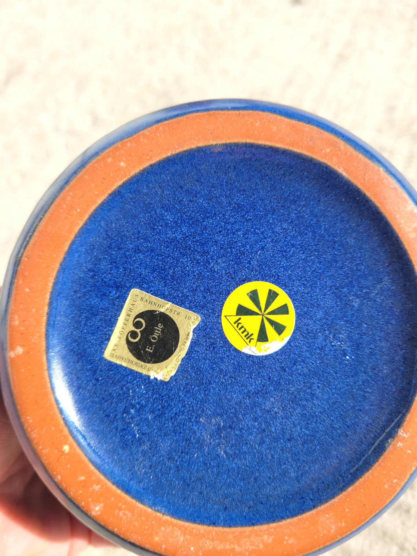 Il s’agit d’une production des années 60 / 70 par la manufacture allemande KMK (étiquette présente dessous) (Kupfermühle Keramik Manufaktur), en ex Allemagne de l’ouest.