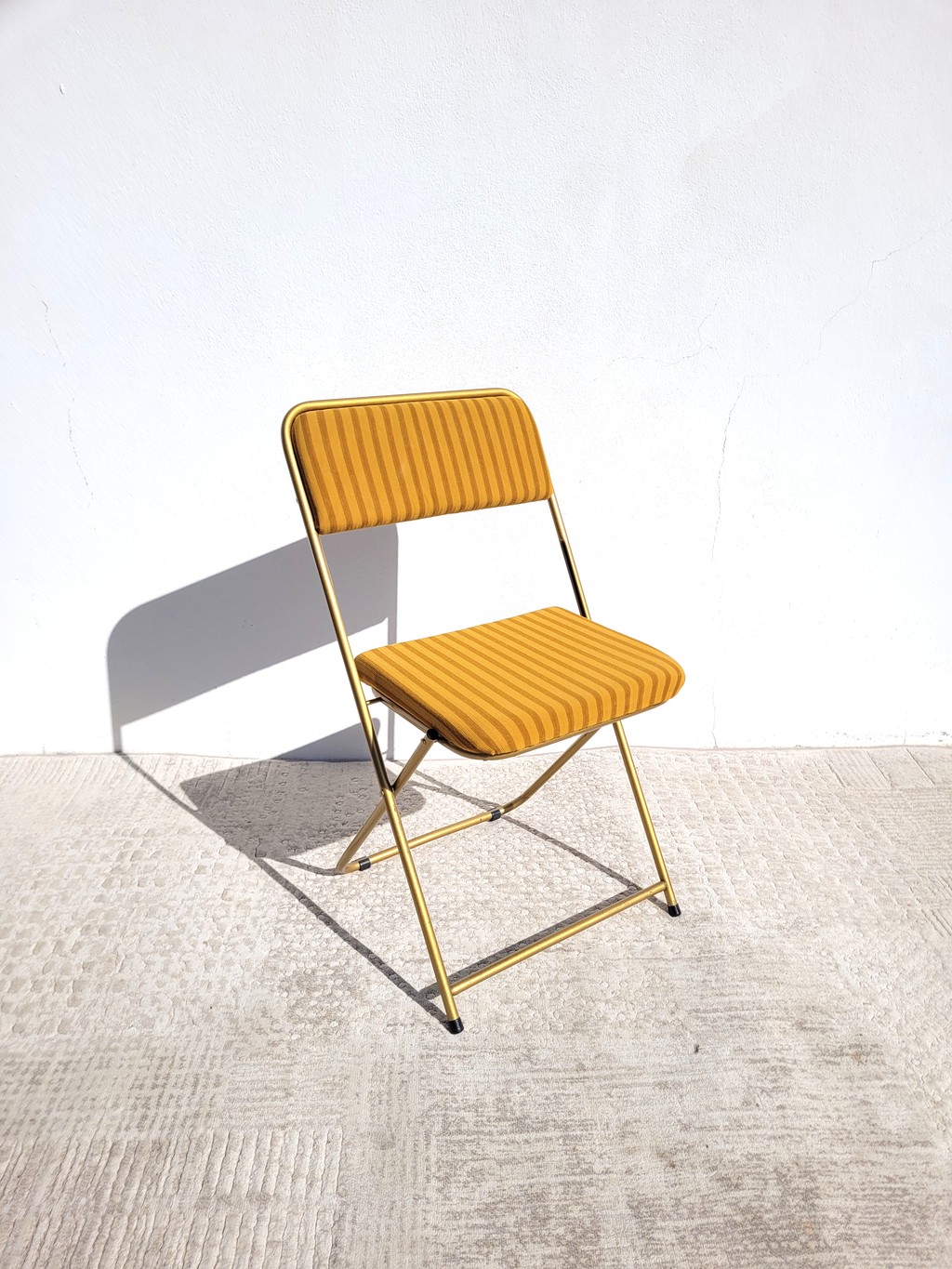 L’assise et le dossier sont matelassé en tissu jaune moutarde à rayures et c’est en bon état.