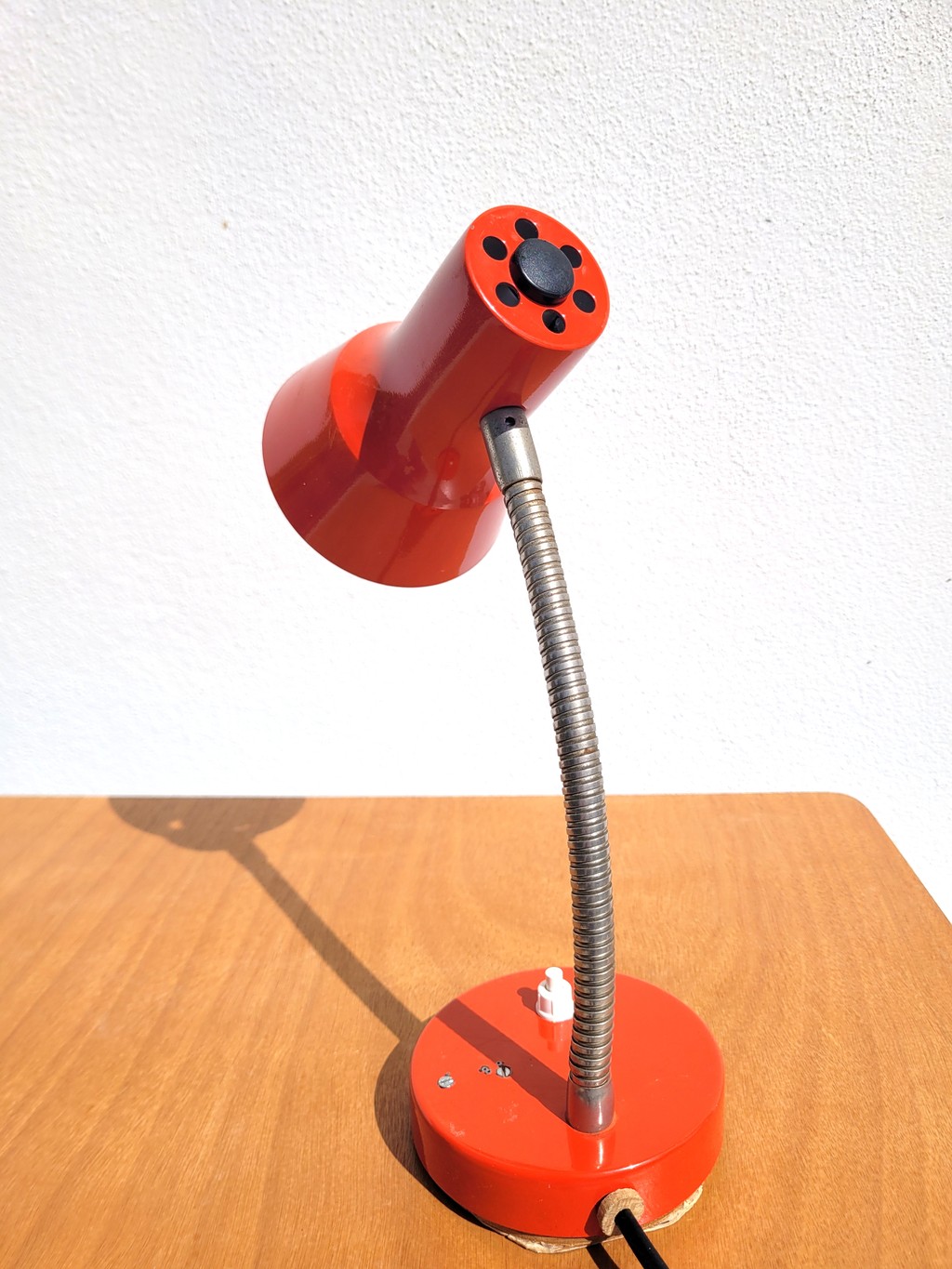 Ce modèle est en métal laqué orange, monté sur un bras flexible permettant d’orienter la lumière. La base est assortie, avec un interrupteur intégré.