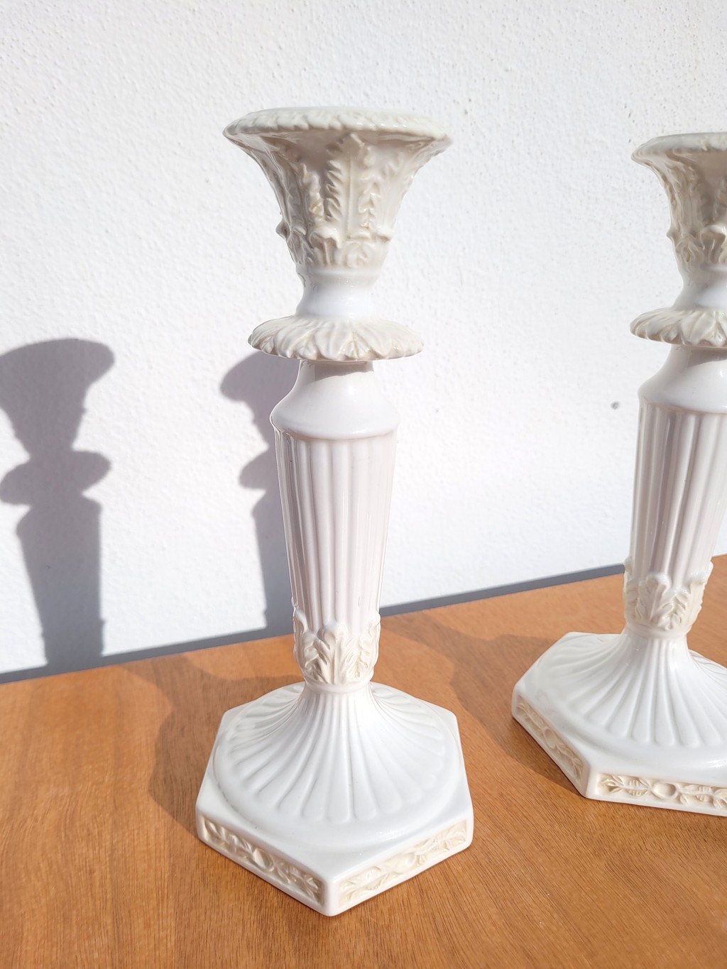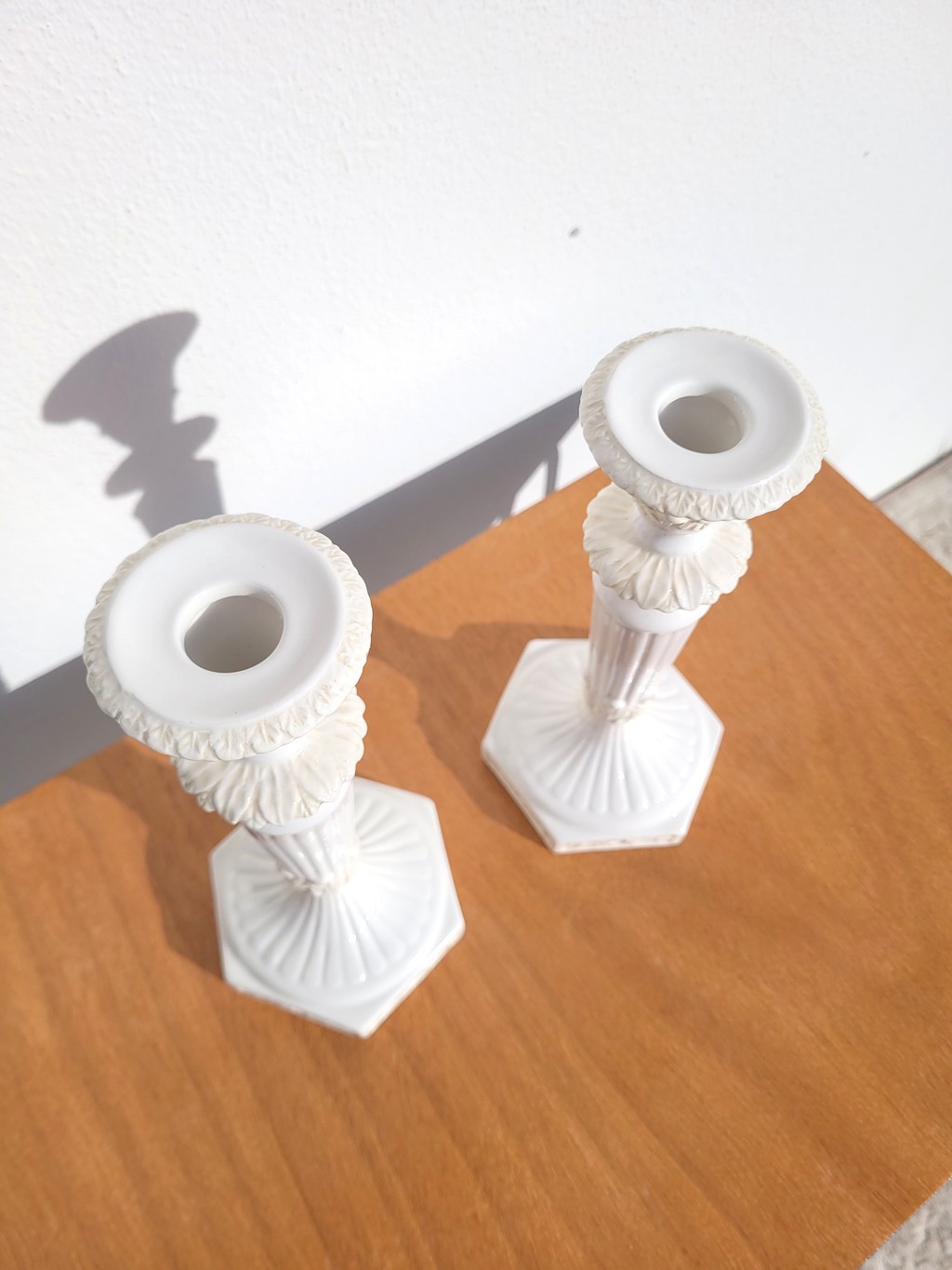 Il s’agit de bougeoirs de style néoclassique avec une colonne cannelée et une base hexagonale ornée de motifs de feuilles.