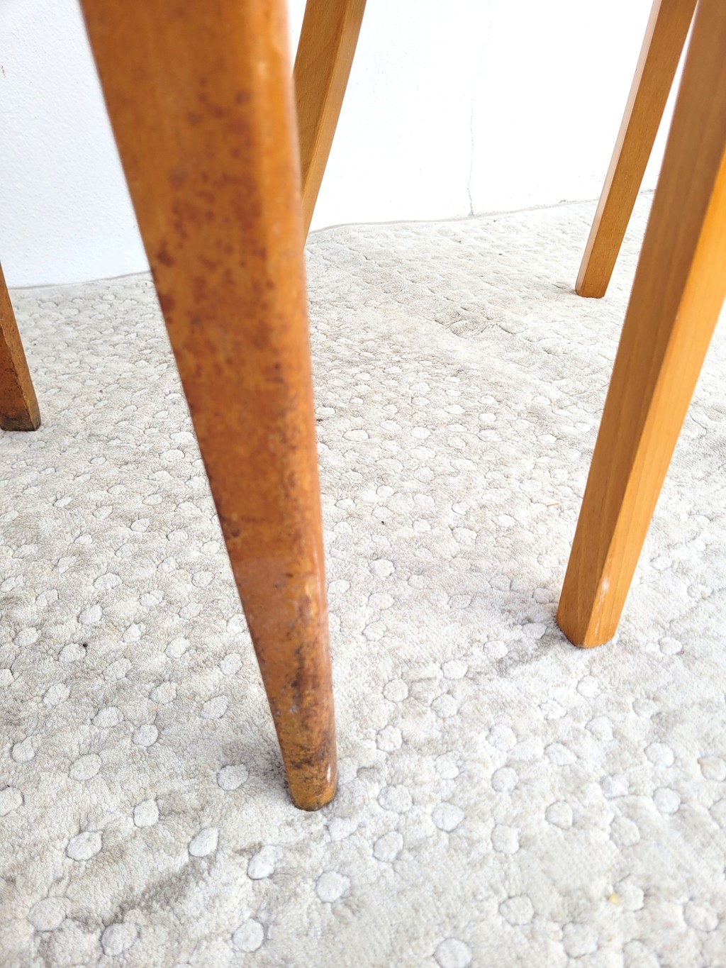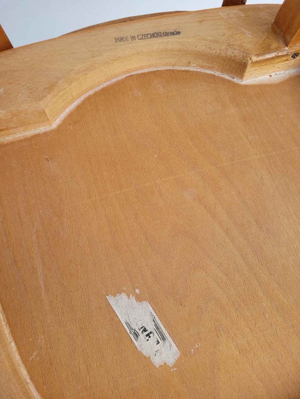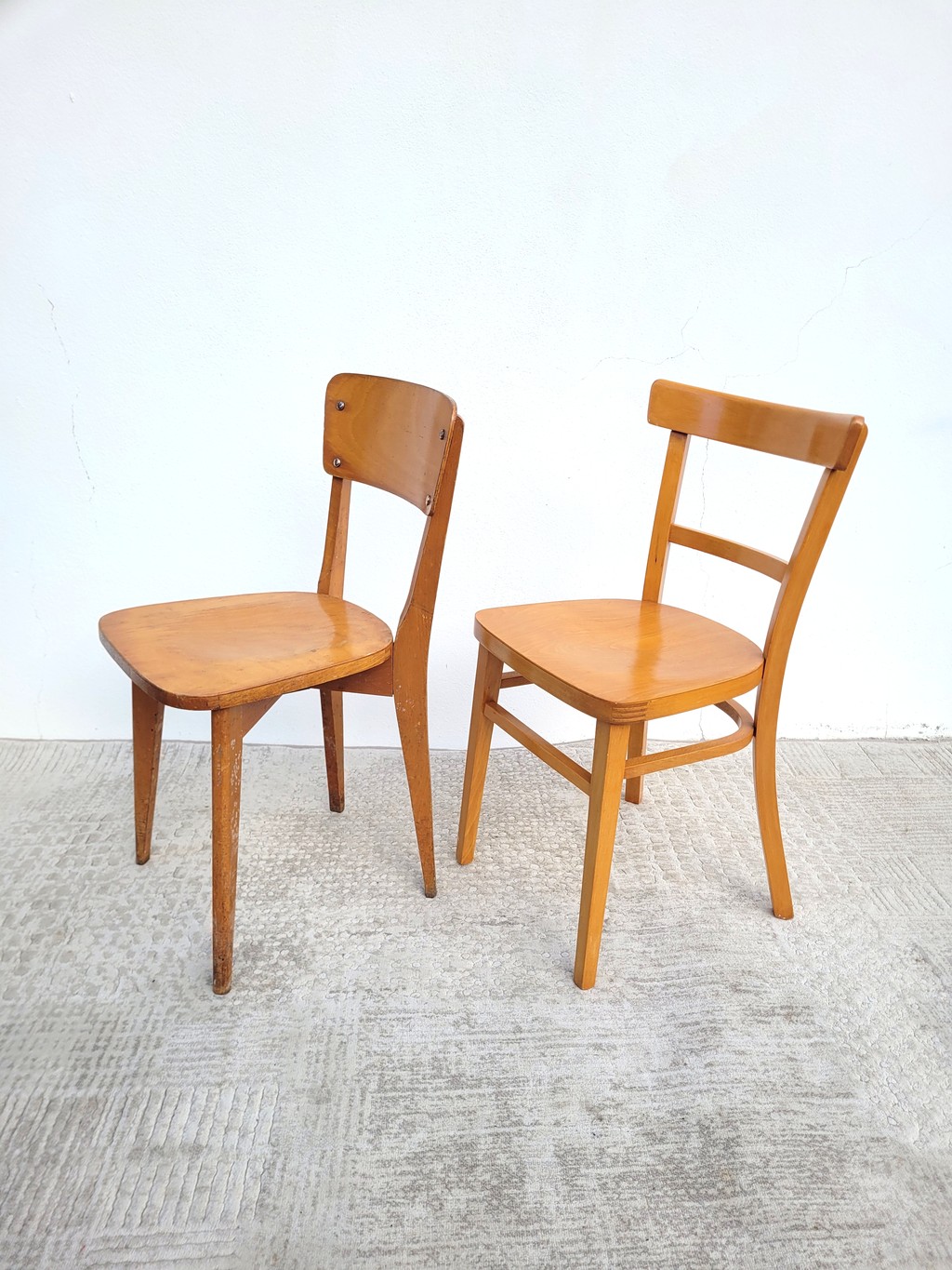 Il s’agit de chaises en bois de hêtre vernis solide et stable, dont une est du célèbre fabricant Thonet (celle avec cette entretoise en bois courbé aux pieds).