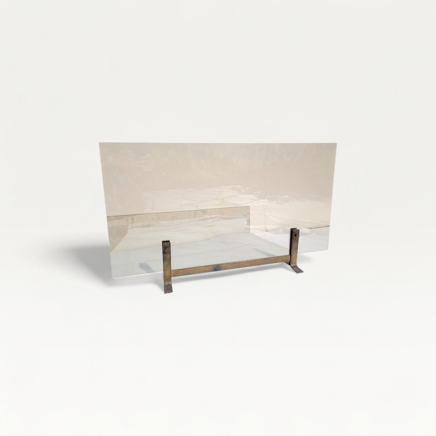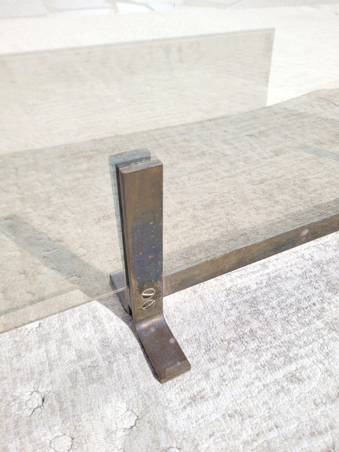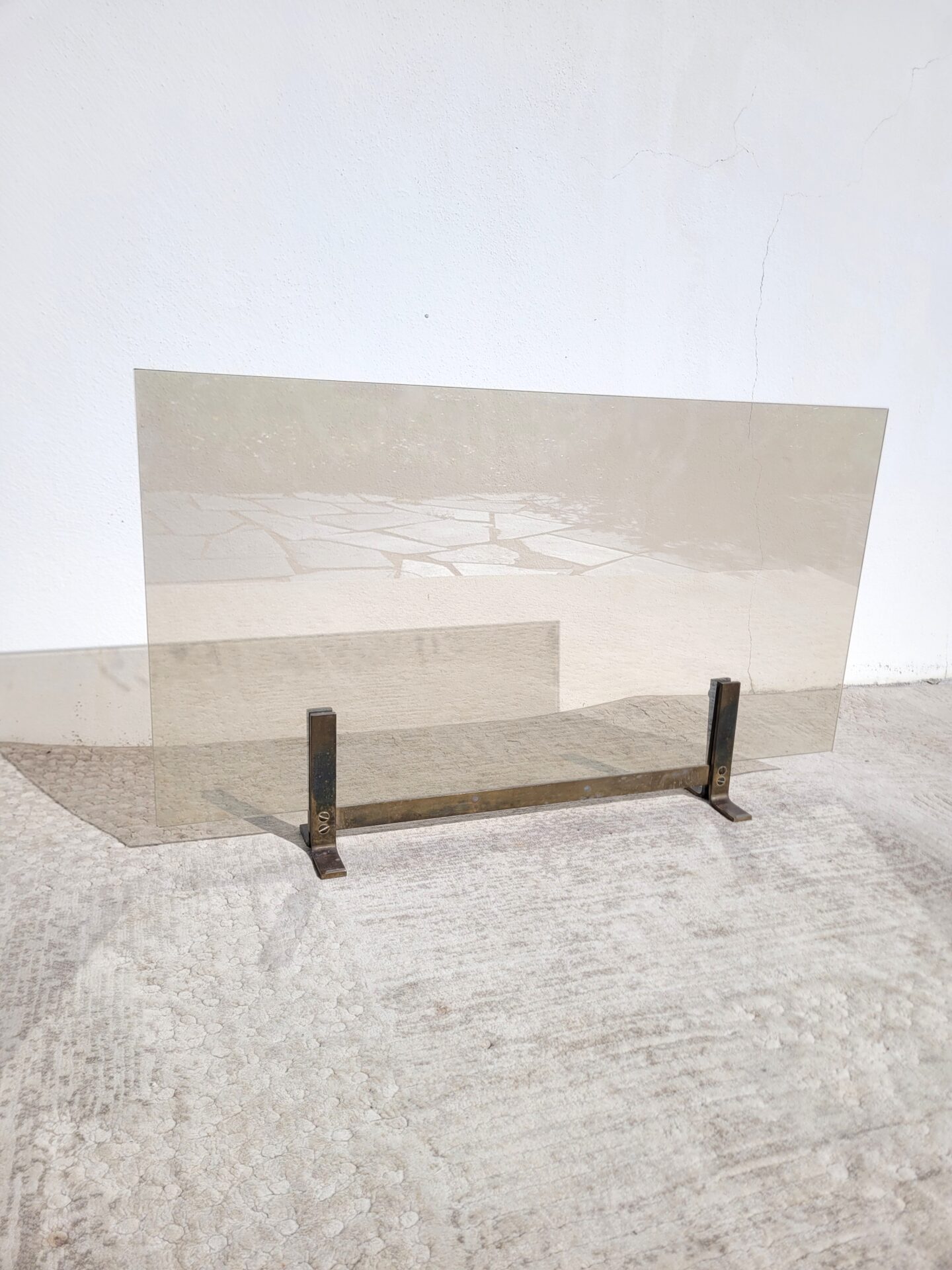 Il se compose d’une large plaque en verre fumé épais et repose sur un piètement en laiton / bronze doré d’une très belle qualité.