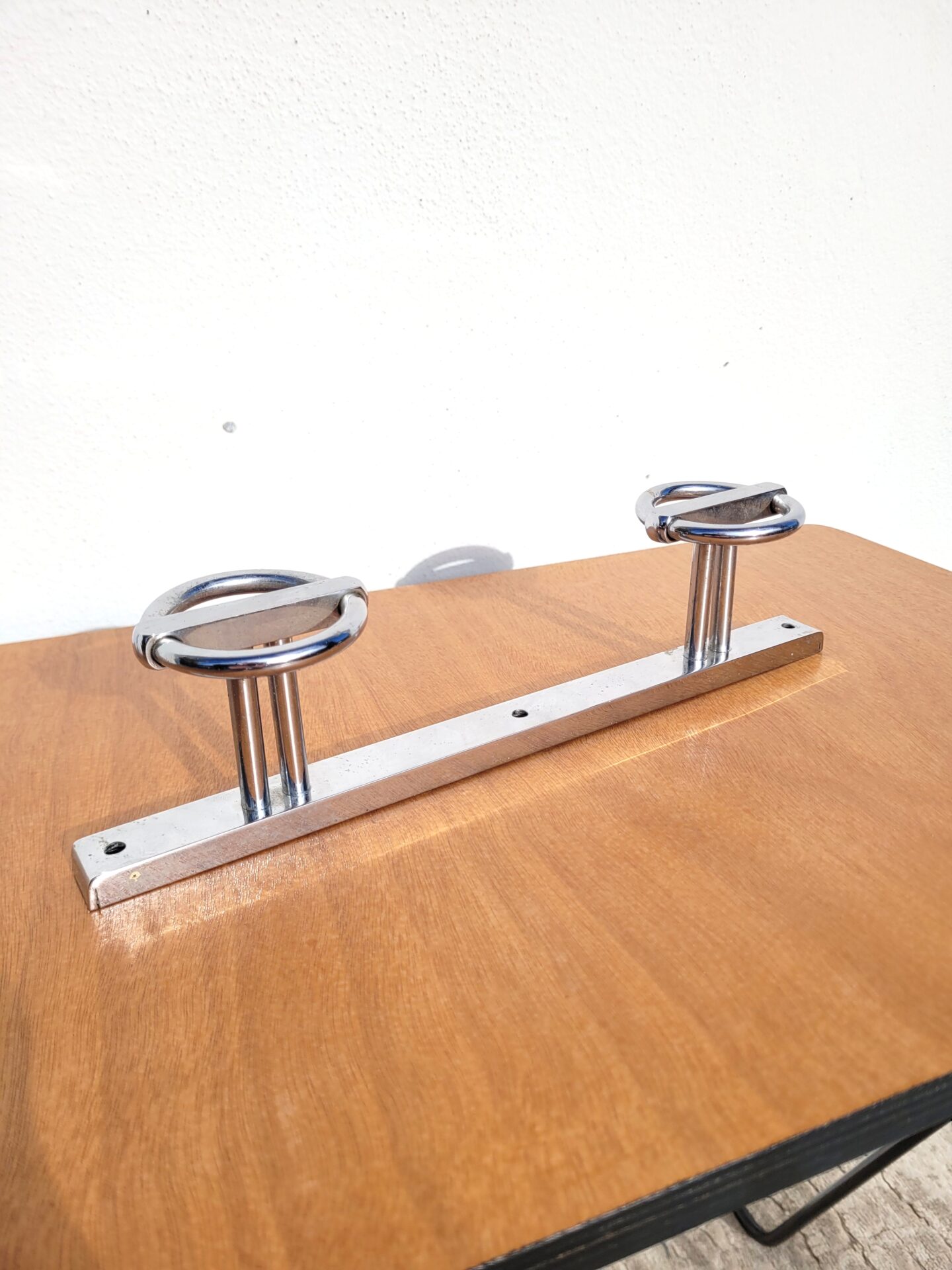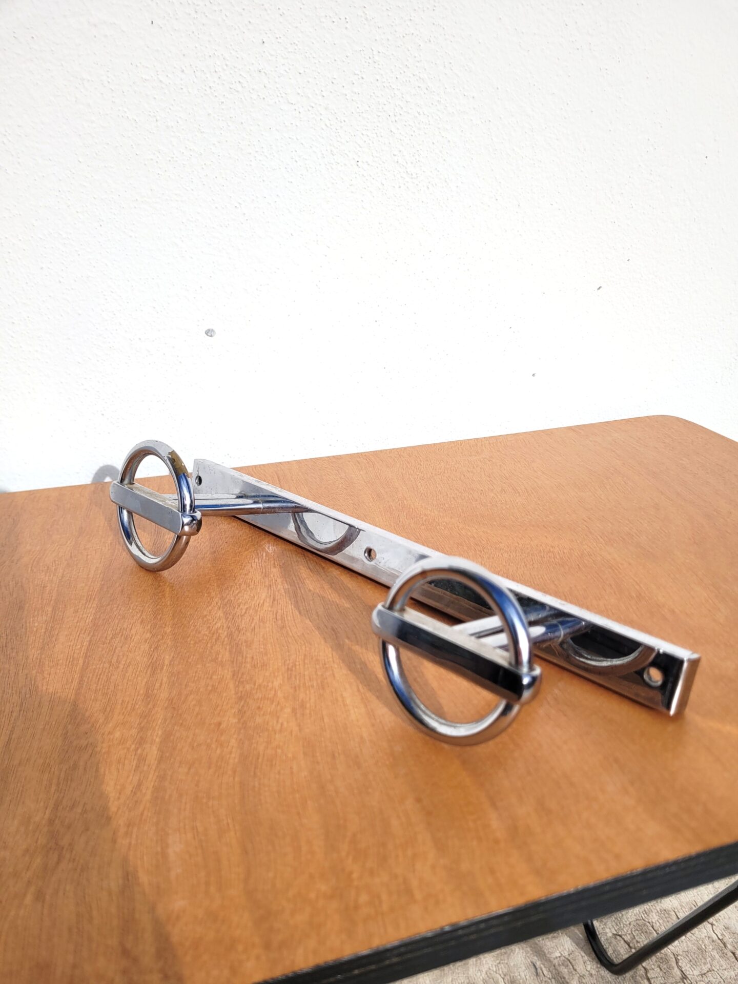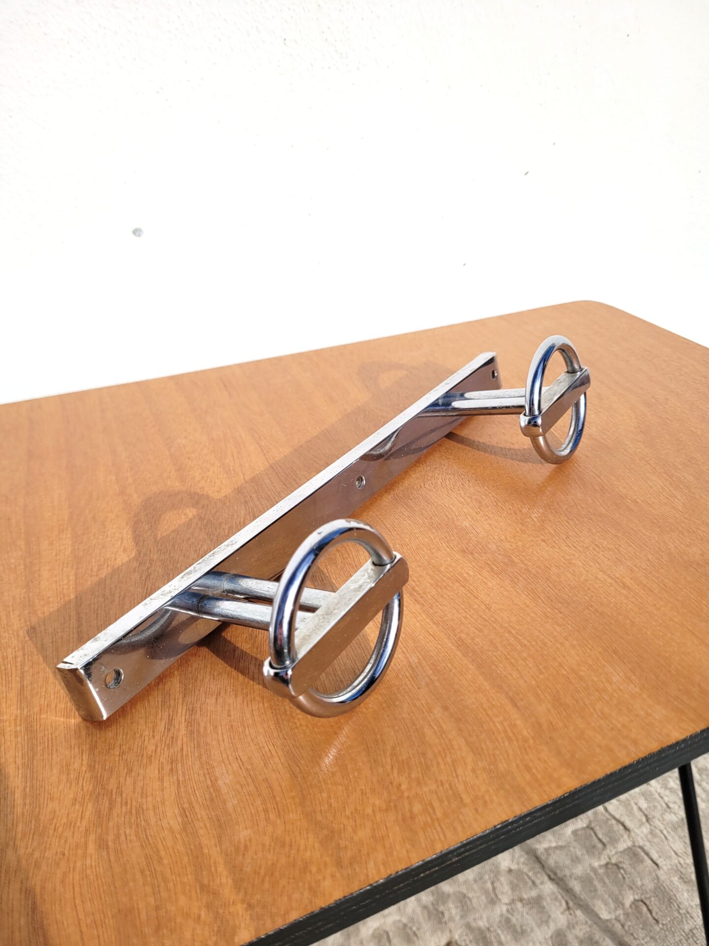 Je vous propose ce porte manteaux mural souvent attribué à l’influence et au design de Jean Royère, célèbre décorateur et designer français. Il est caractéristique de son travail pour la quincaillerie de luxe et les accessoires des années 40-50, au design moderniste, et cette forme de double boucle / anneau.