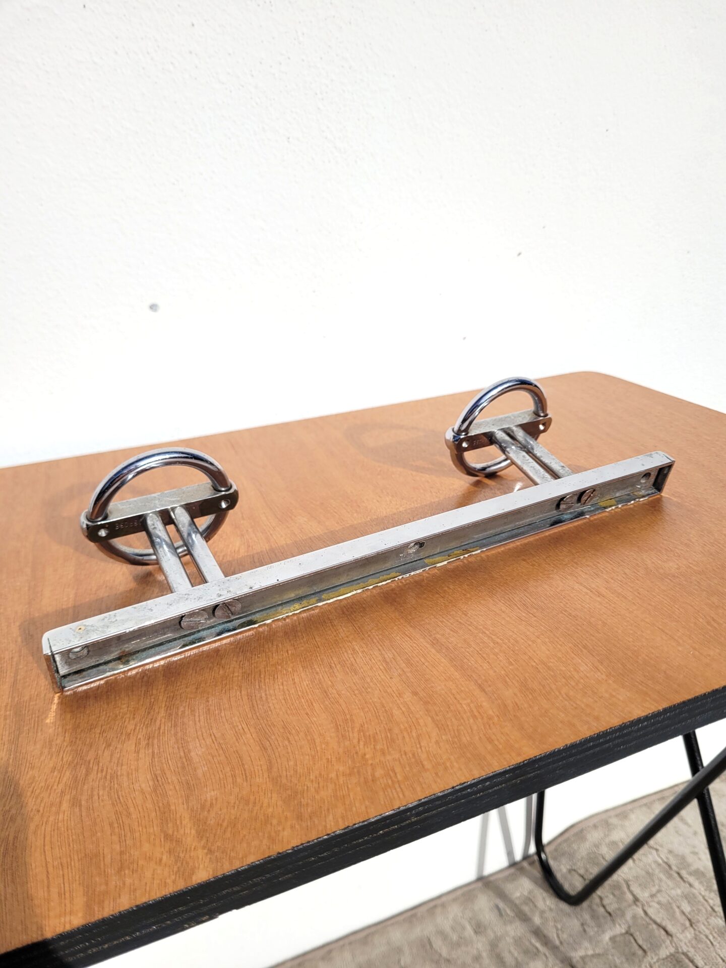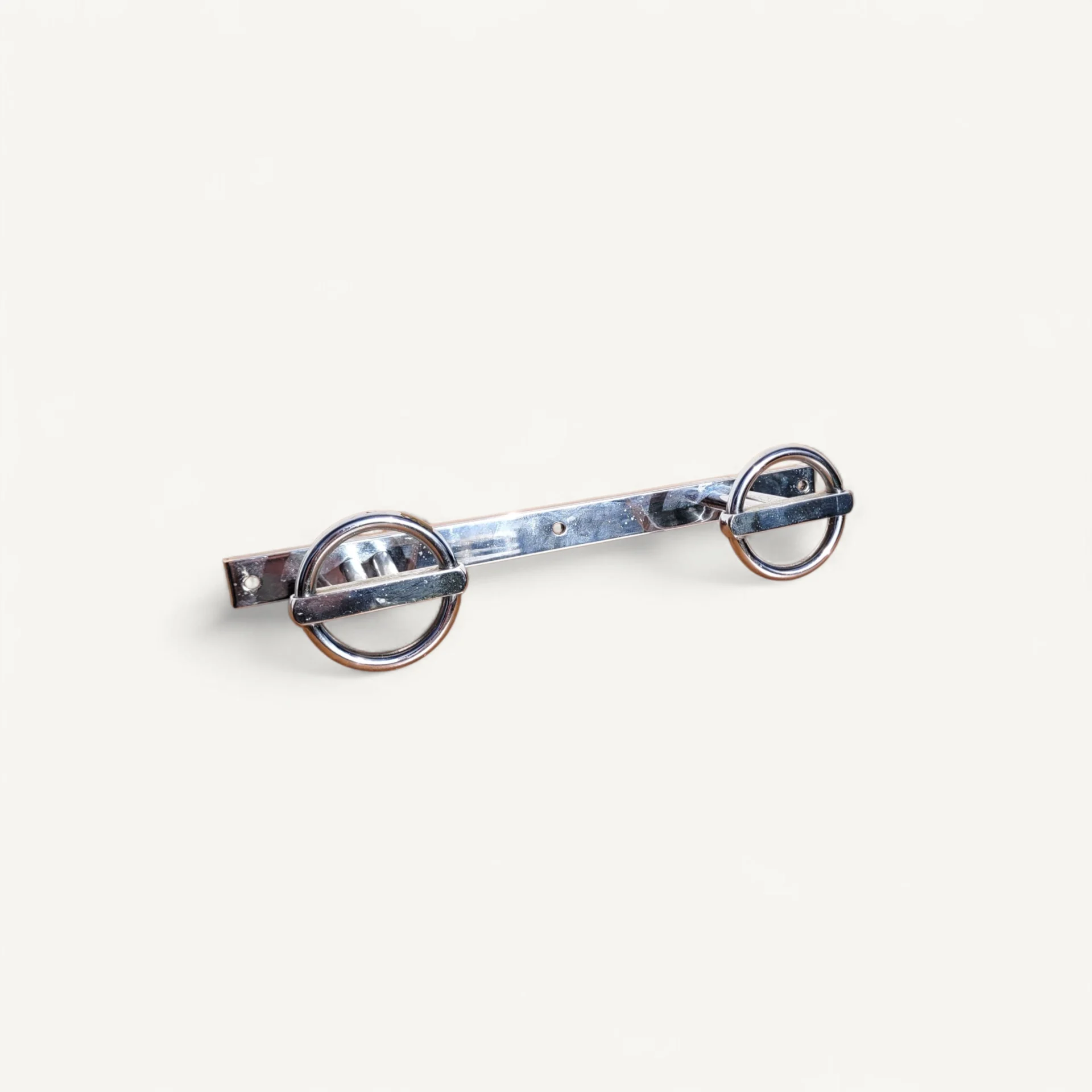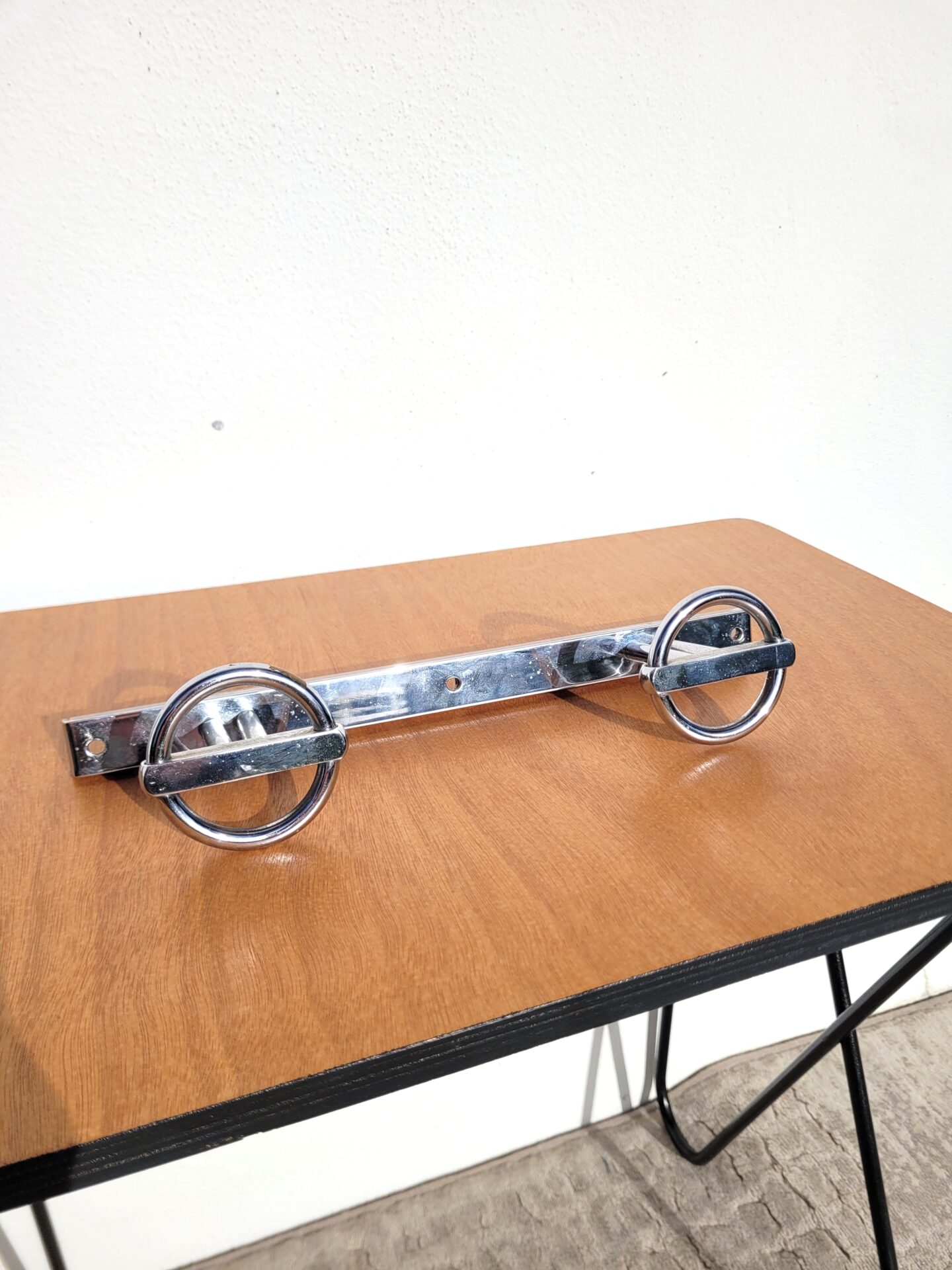 Je vous propose ce porte manteaux mural souvent attribué à l’influence et au design de Jean Royère, célèbre décorateur et designer français. Il est caractéristique de son travail pour la quincaillerie de luxe et les accessoires des années 40-50, au design moderniste, et cette forme de double boucle / anneau.