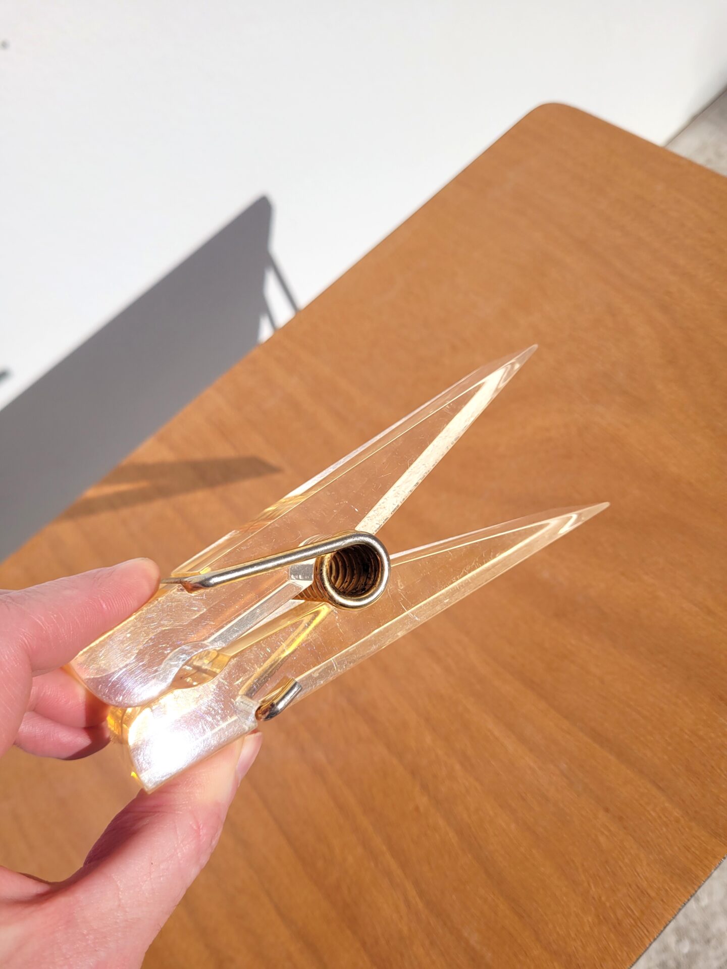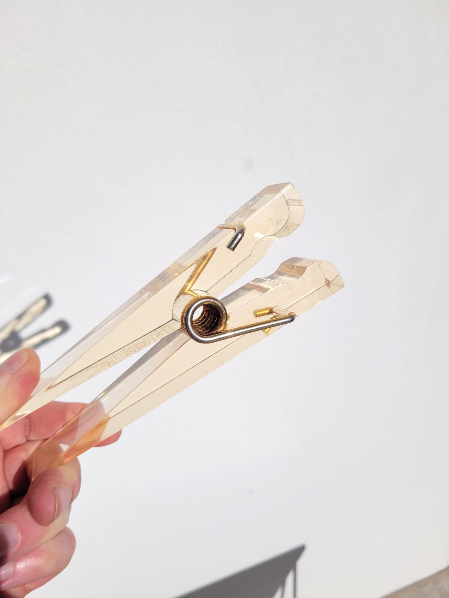 Elle est en plastique plexiglas transparent / jaune très pâle et son ressort est doré.