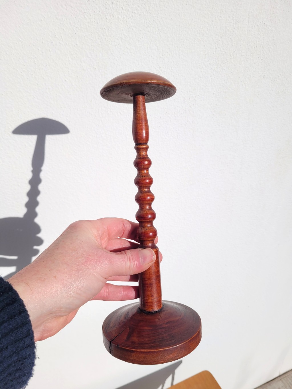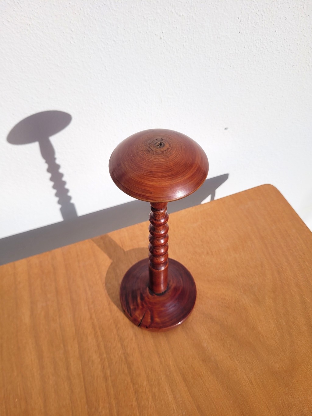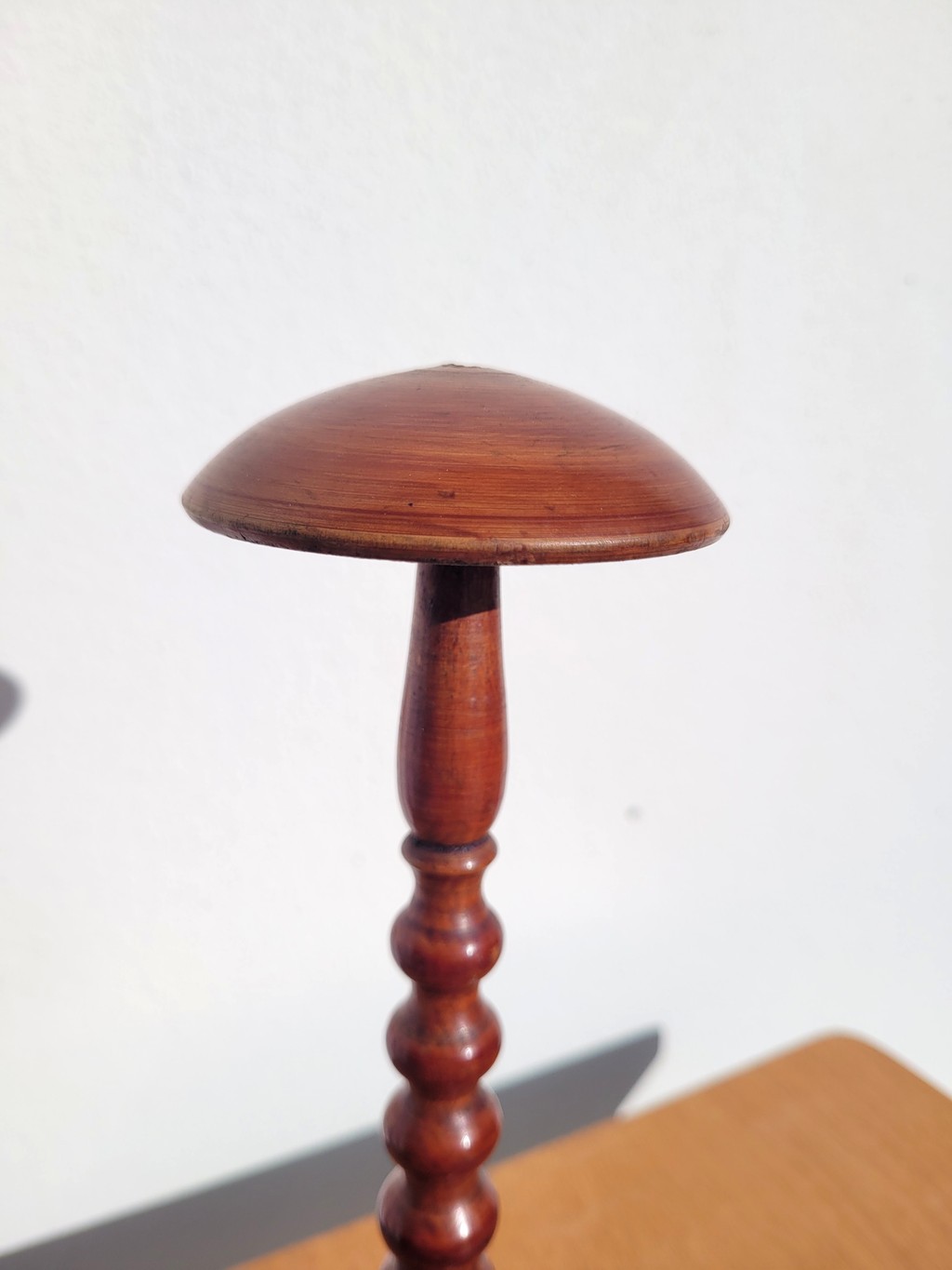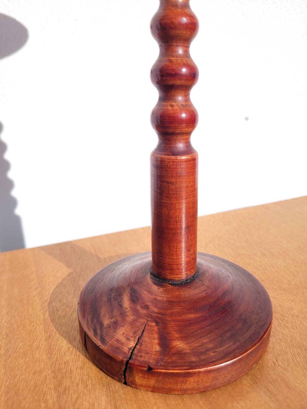 Il est en bois tourné vernis, probablement un fruitier, avec une patine acajou ou merisier assez chaleureuse.