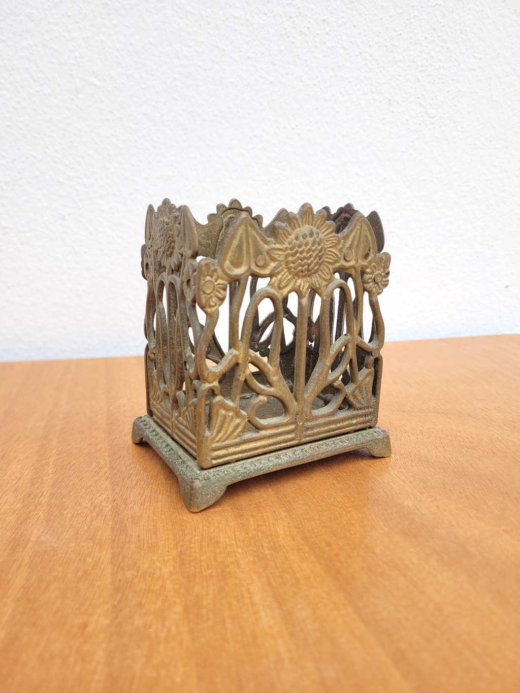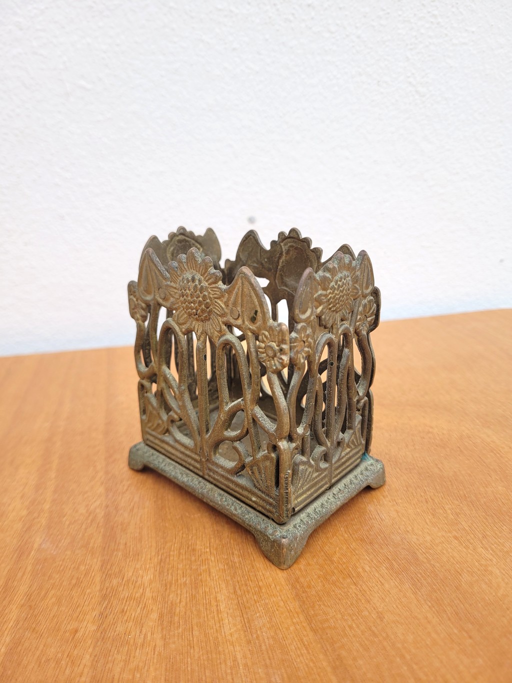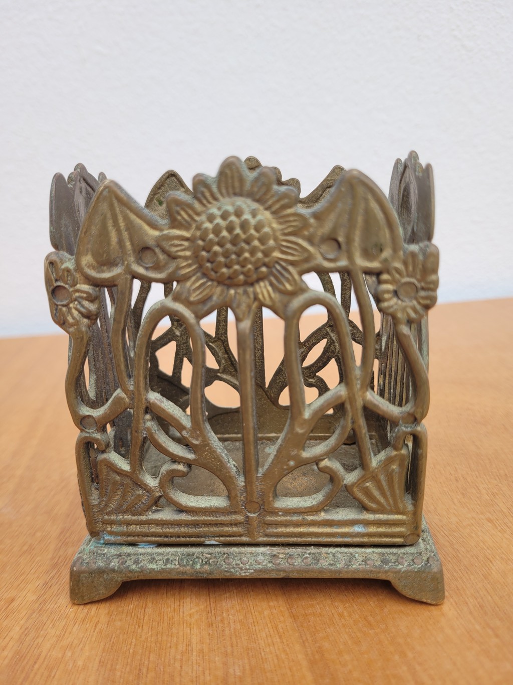 Un joli travail en laiton ajouré, présentant des motifs floraux de tournesols sur chaque face.