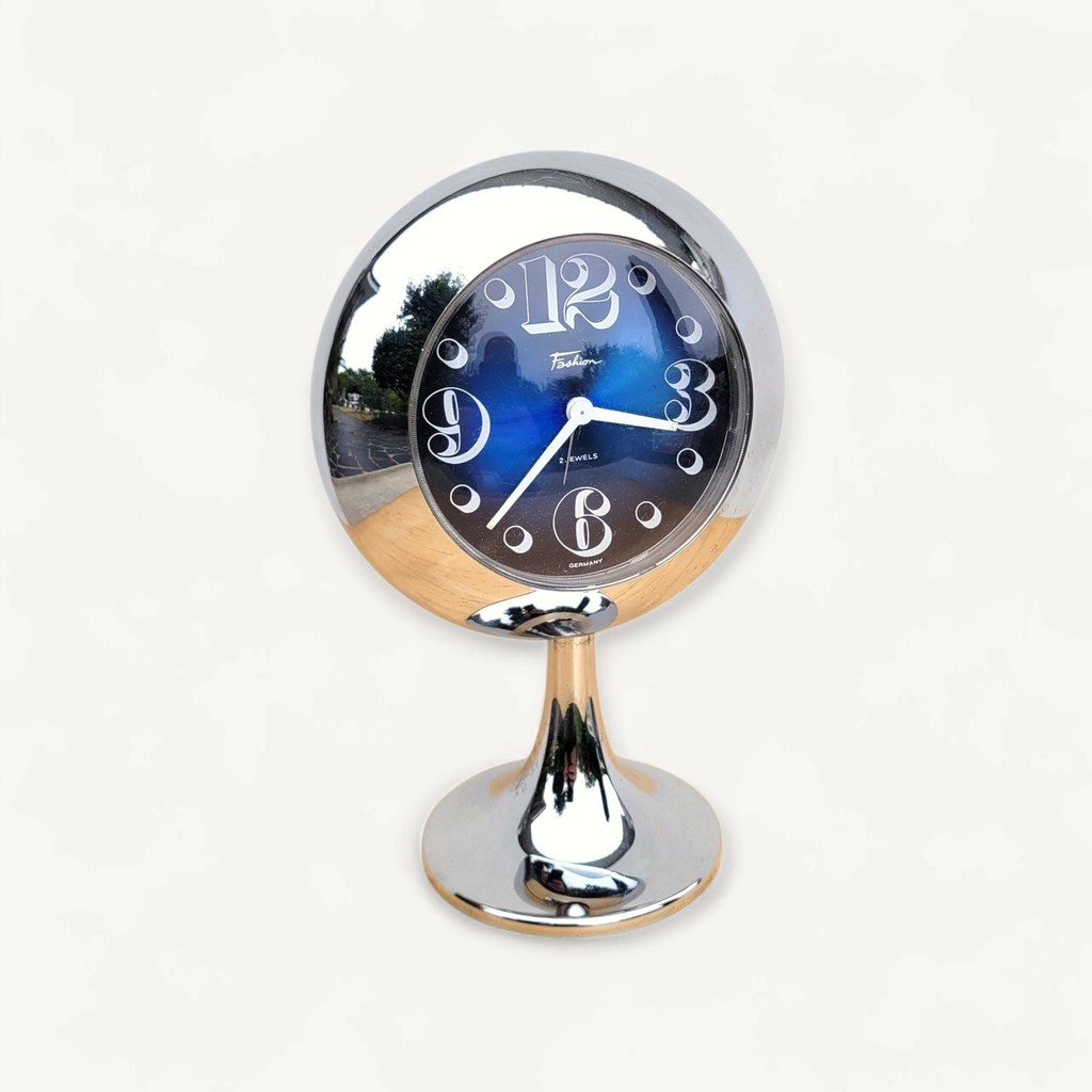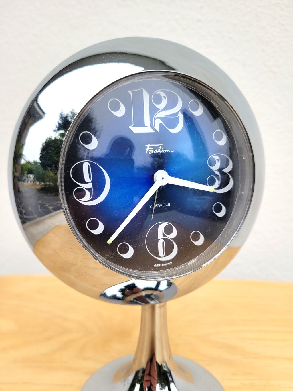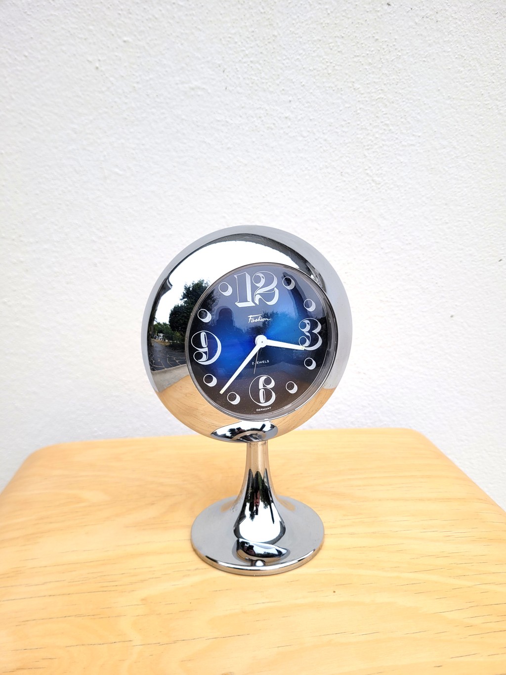 Le style est Space age avec son pied tulipe et ce gros cadran chromé au fond bleu métallique. L’ensemble est en plastique.