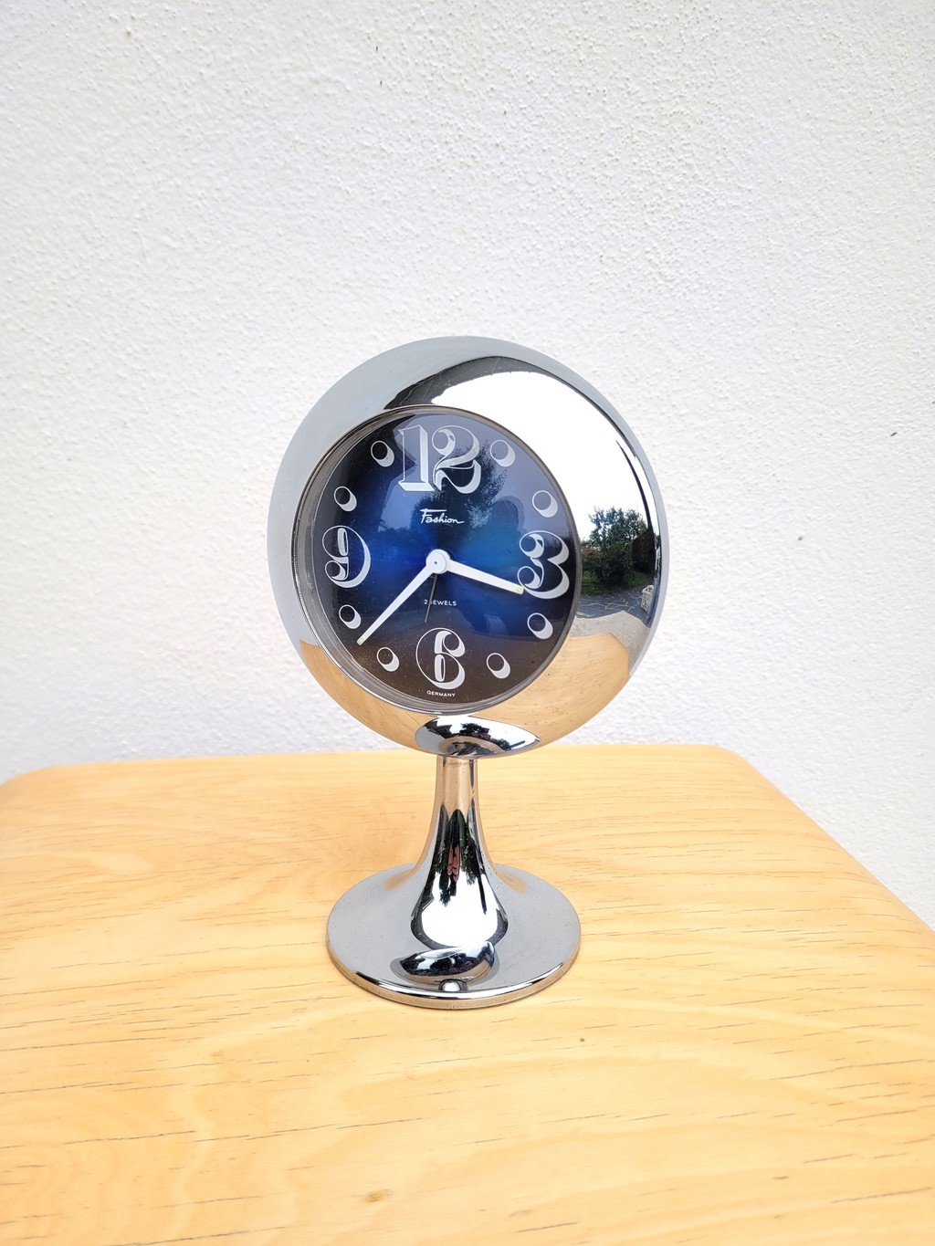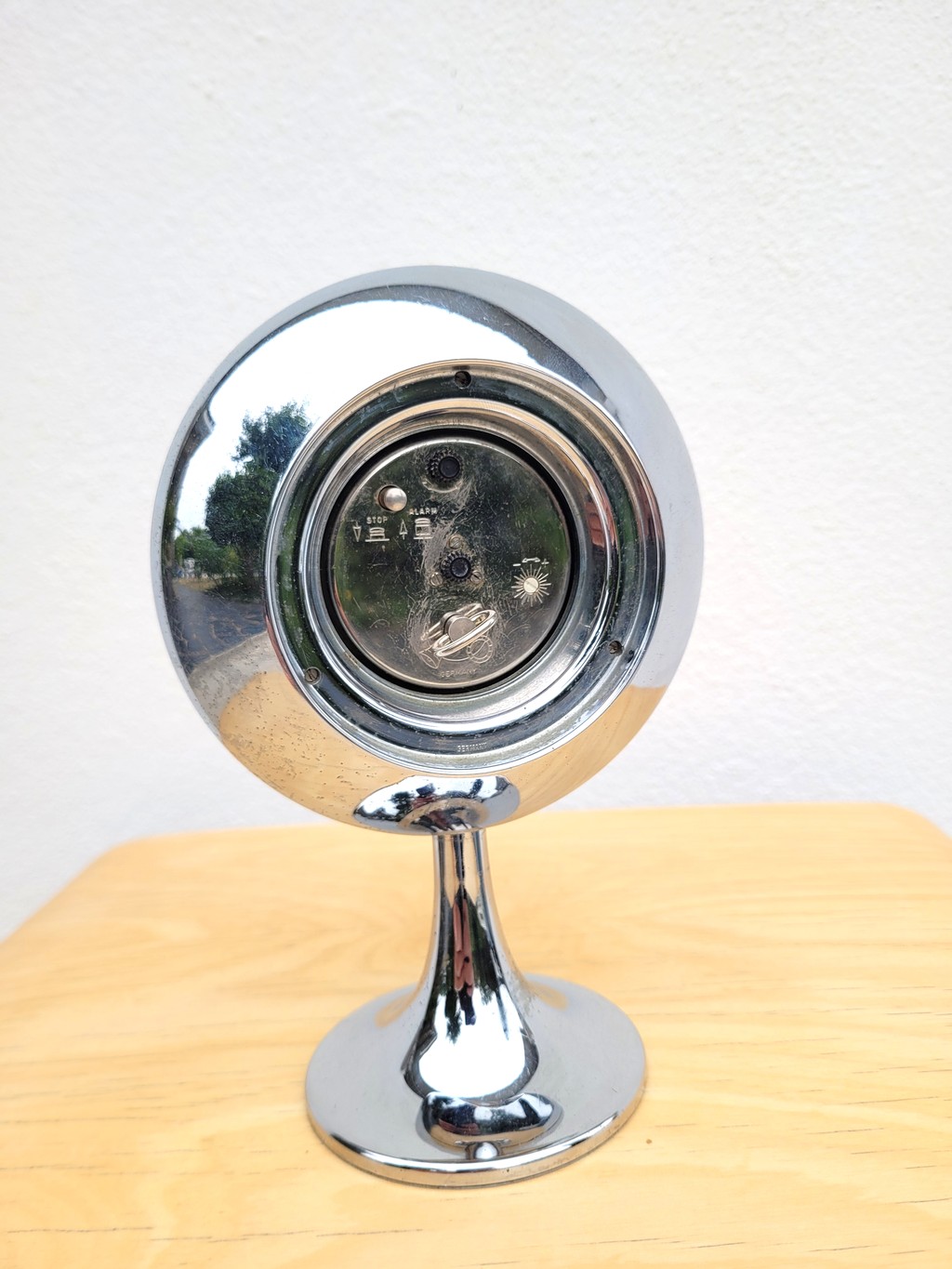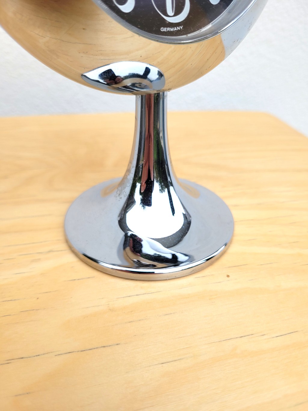 Le style est Space age avec son pied tulipe et ce gros cadran chromé au fond bleu métallique. L’ensemble est en plastique.