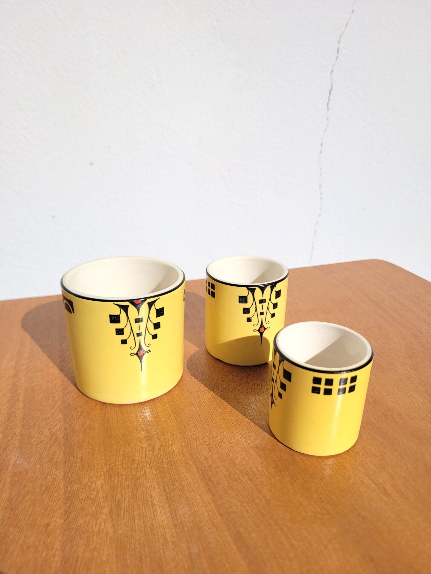 Ces pots sont en céramique, faïence fine jaune et noir au décor géométrique caractéristique de la periode Art Deco.