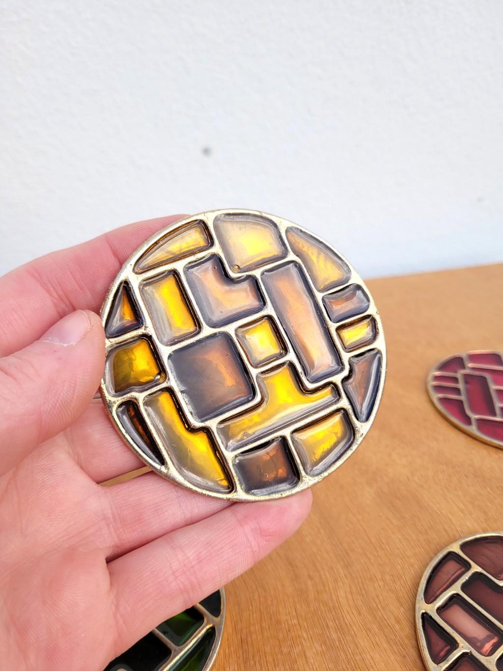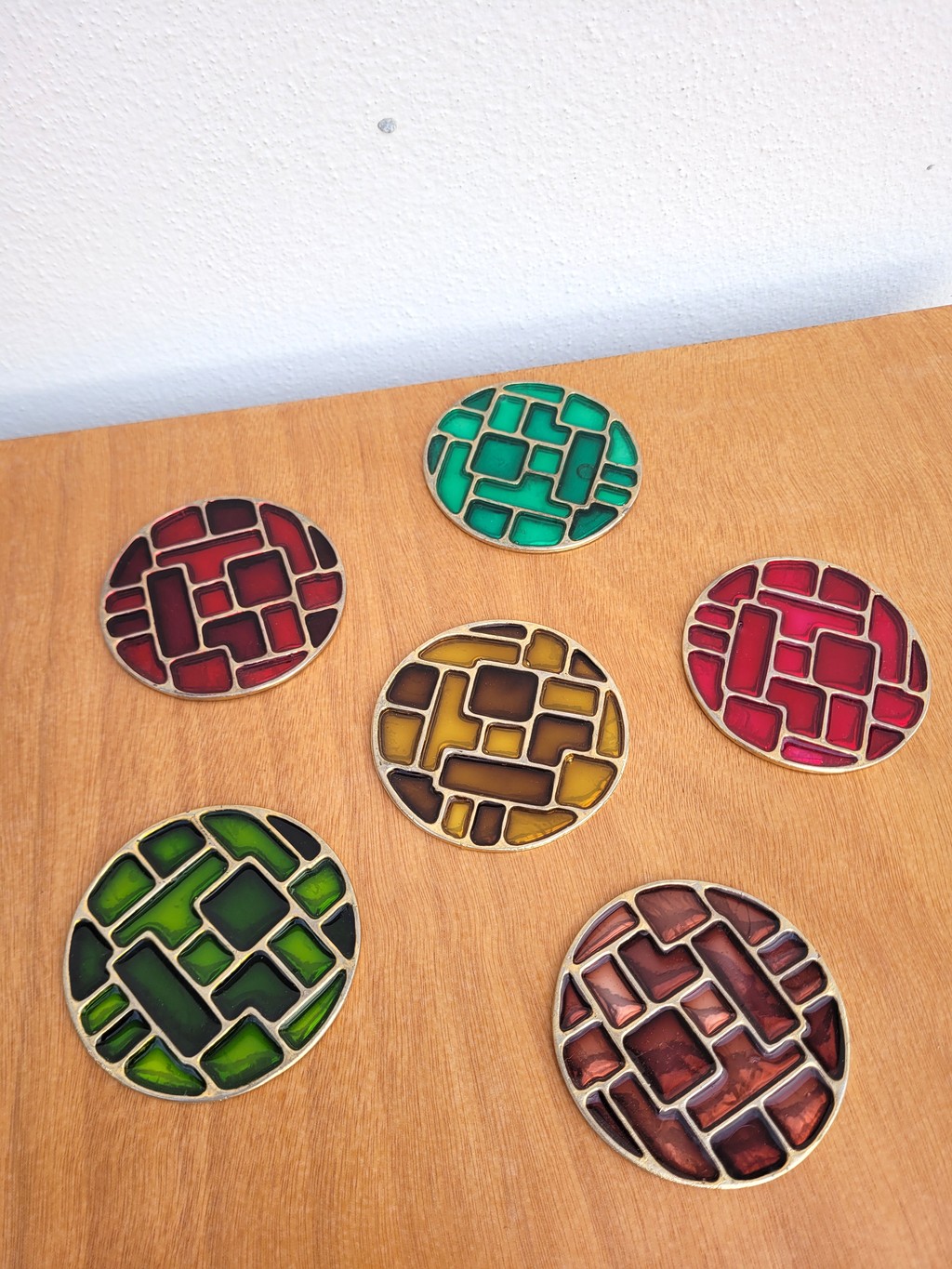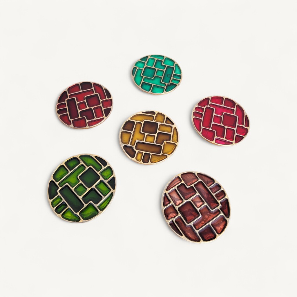 Dans l’esprit de Mithé ESPELT, il s’agit de pièces de différentes couleurs cloisonnés dans un métal doré, avec une feutrine rouge au-dessous (manque sur 1 et usures).