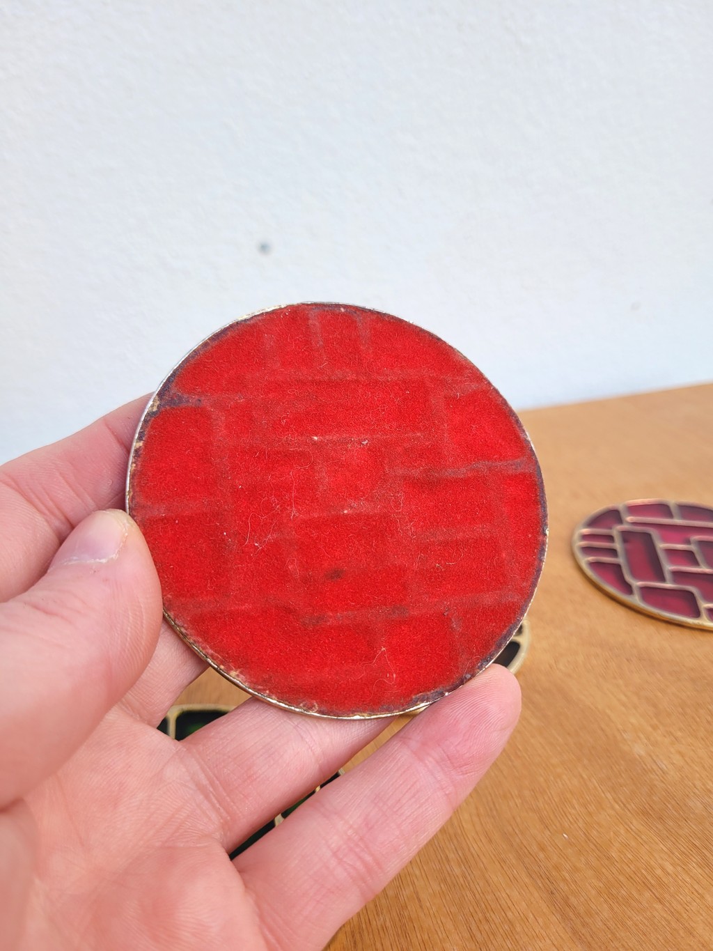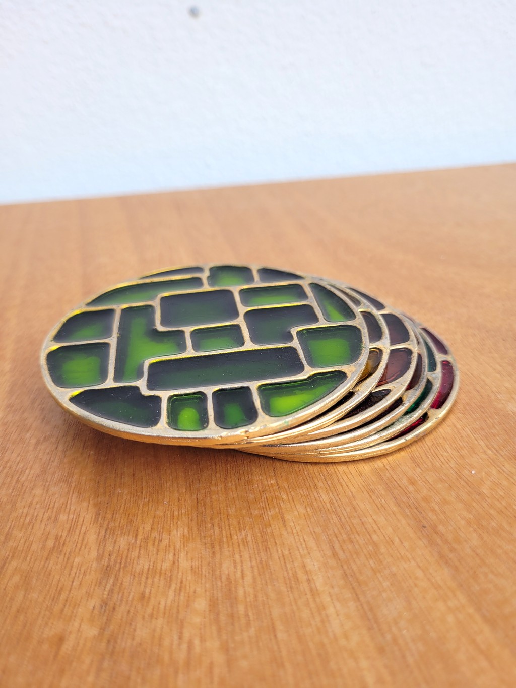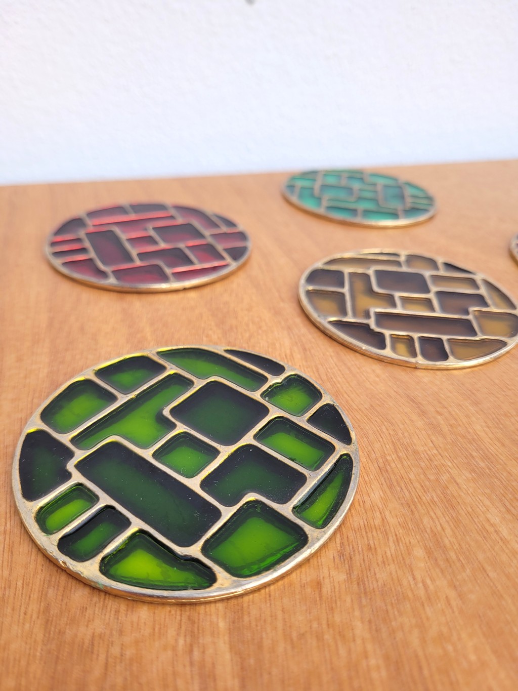 Dans l’esprit de Mithé ESPELT, il s’agit de pièces de différentes couleurs cloisonnés dans un métal doré, avec une feutrine rouge au-dessous (manque sur 1 et usures).