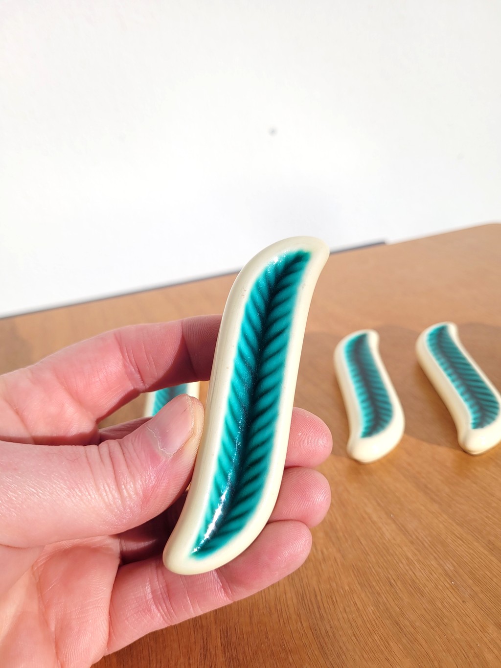 Ils sont en céramiques formant une petite feuille couleur crème et vert tropical.