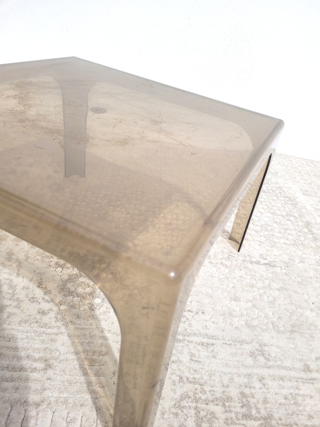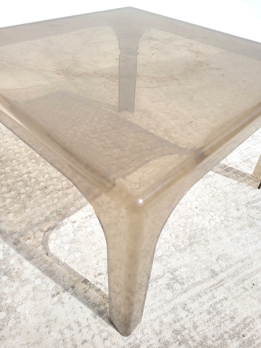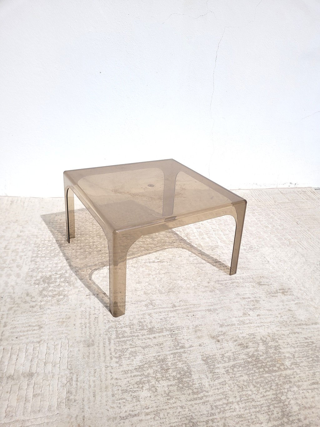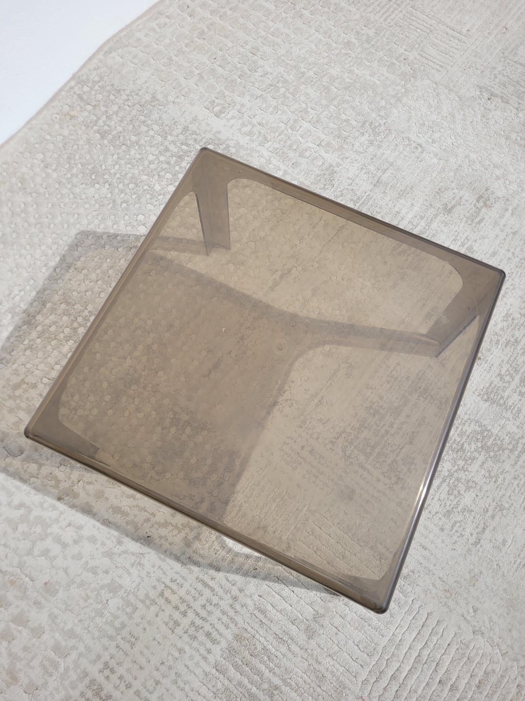 Je vous propose cette table basse carrée en plastique fumé, à l’image du mobilier des années 70.